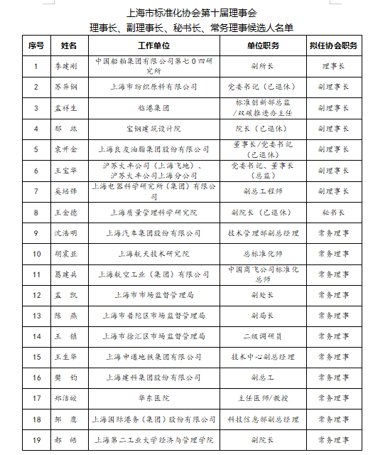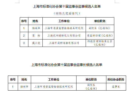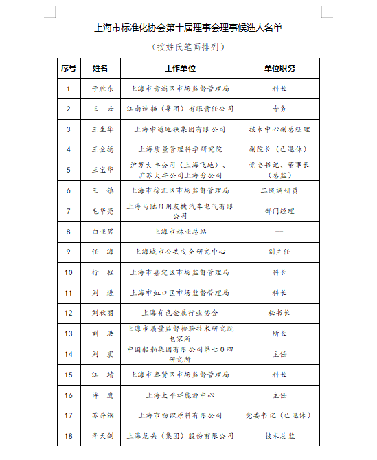 附件:上海市标准化协会第十届理事会、监事会候选人名单