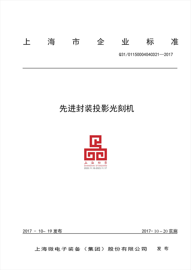 标准名称及编号:先进封装投影光刻机(Q31/0115000404C021—2017)