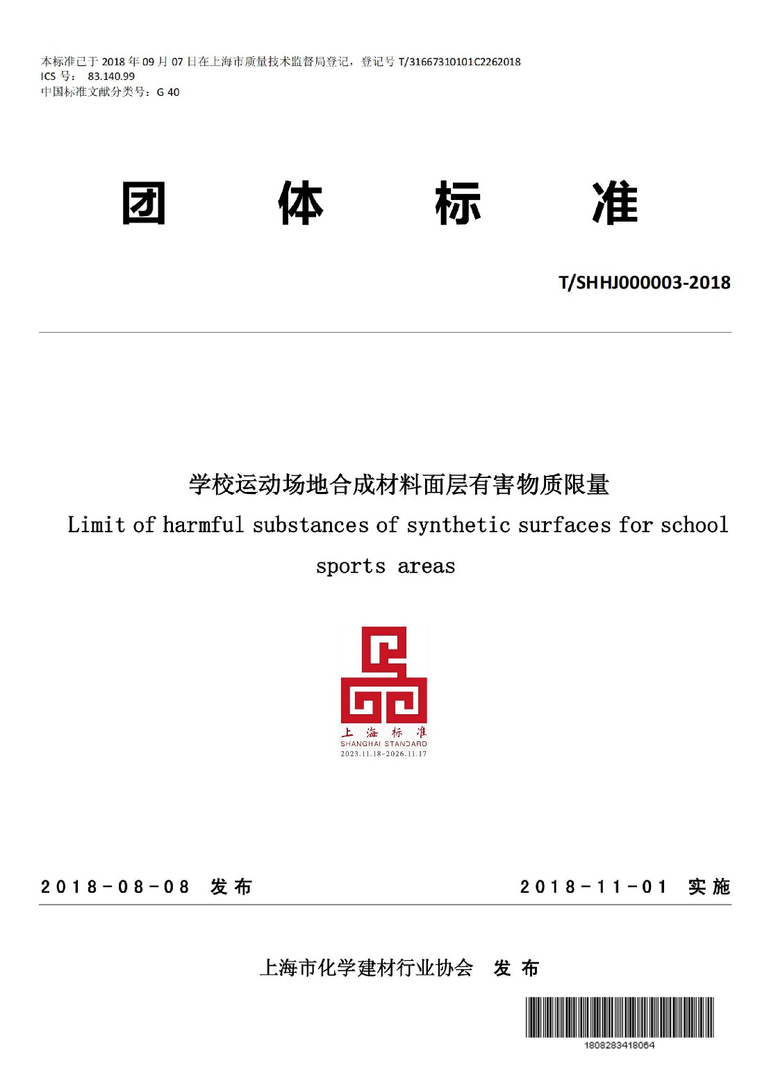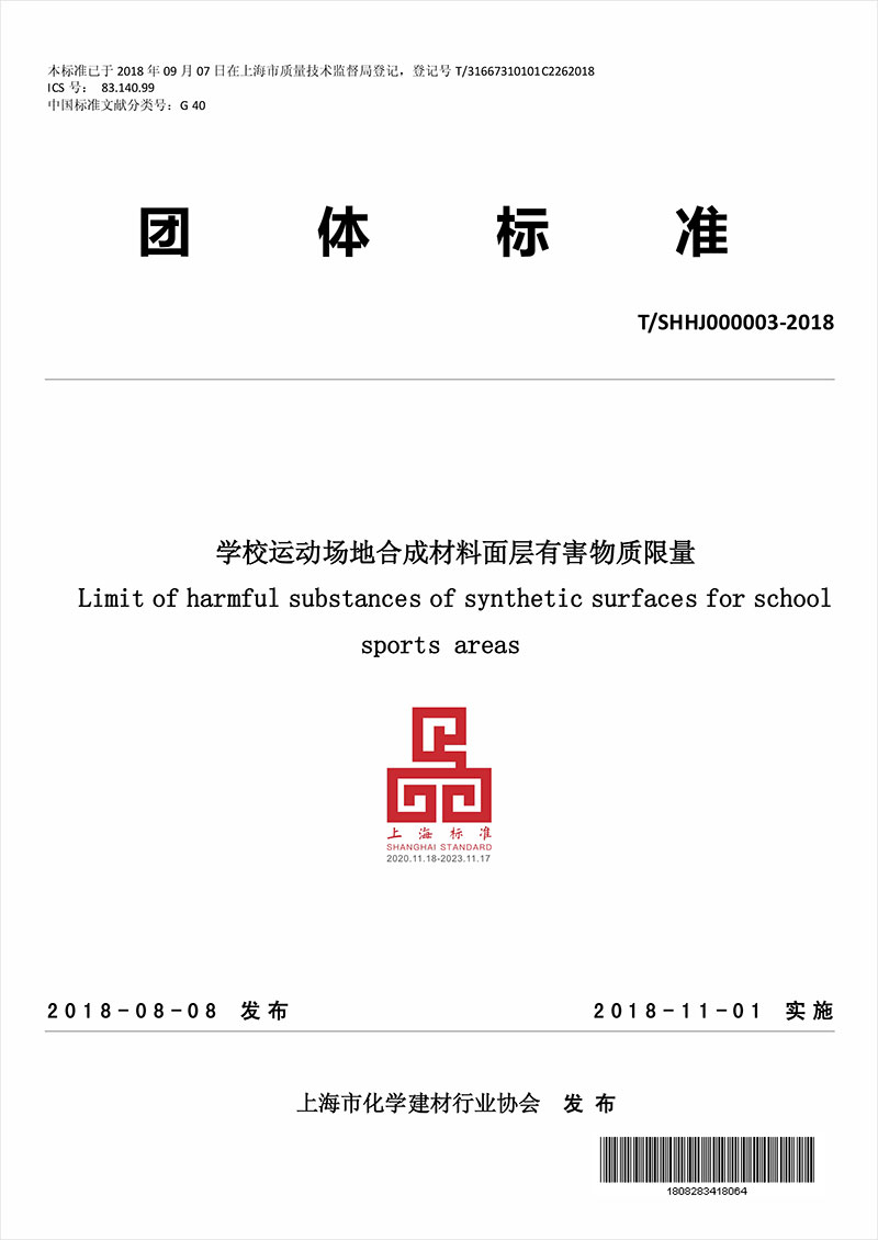 标准名称及编号:学校运动场地合成材料面层有害物质限量(T/SHHJ000003—2018)