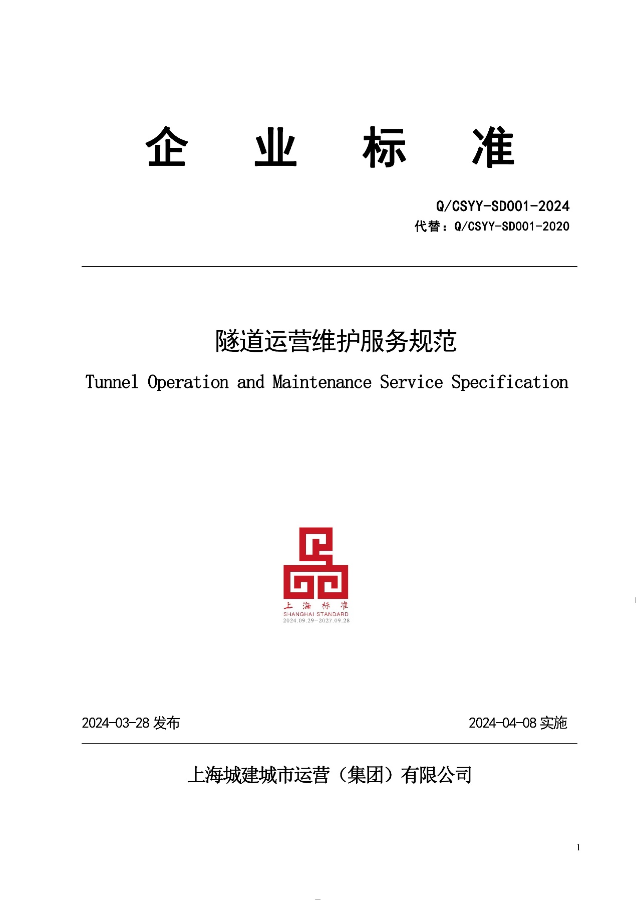 标准名称及编号:隧道运营维护服务规范(Q∕CSYY-SD001-2024)