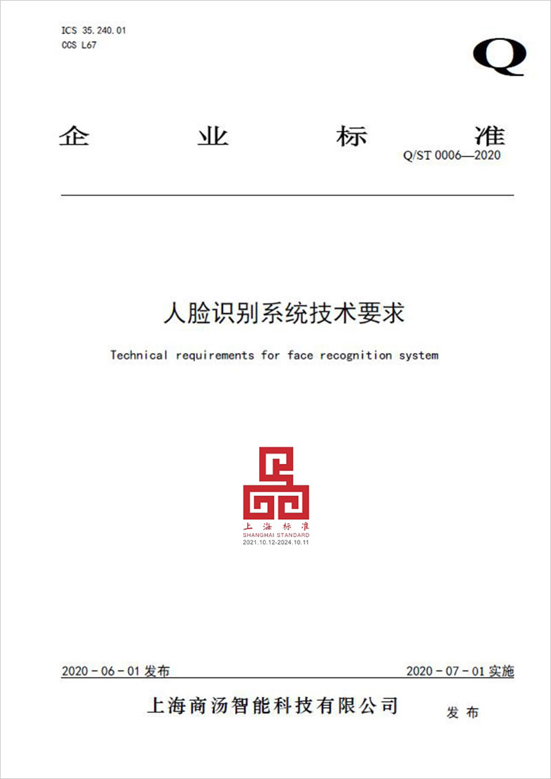 人脸识别系统技术要求(Q/ST 0006——2020)(2021获评、2024复评)