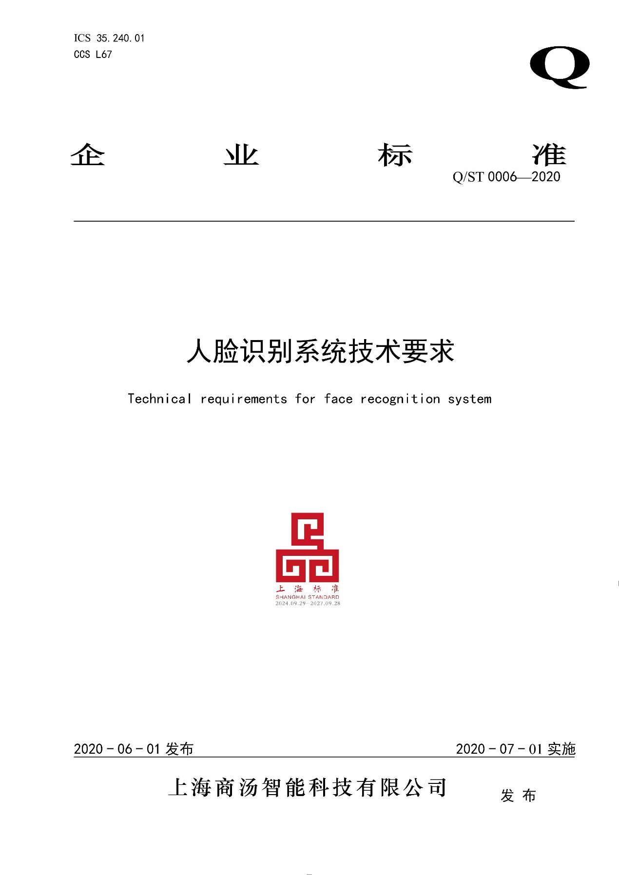 标准名称及编号:人脸识别系统技术要求(Q/ST 0006——2020)