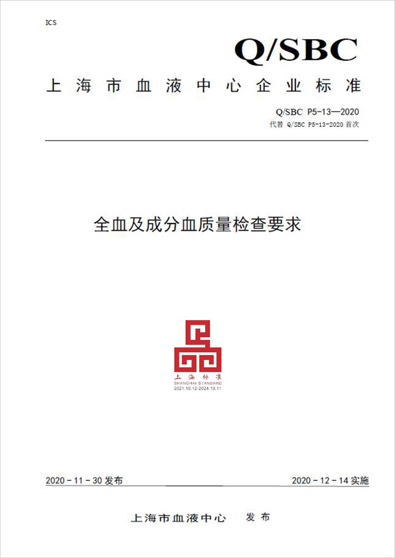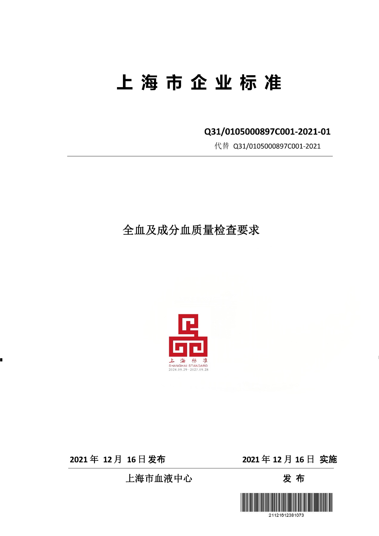 标准名称及编号:全血及成分血质量检查要求(Q∕310105000897C001-2021-01)