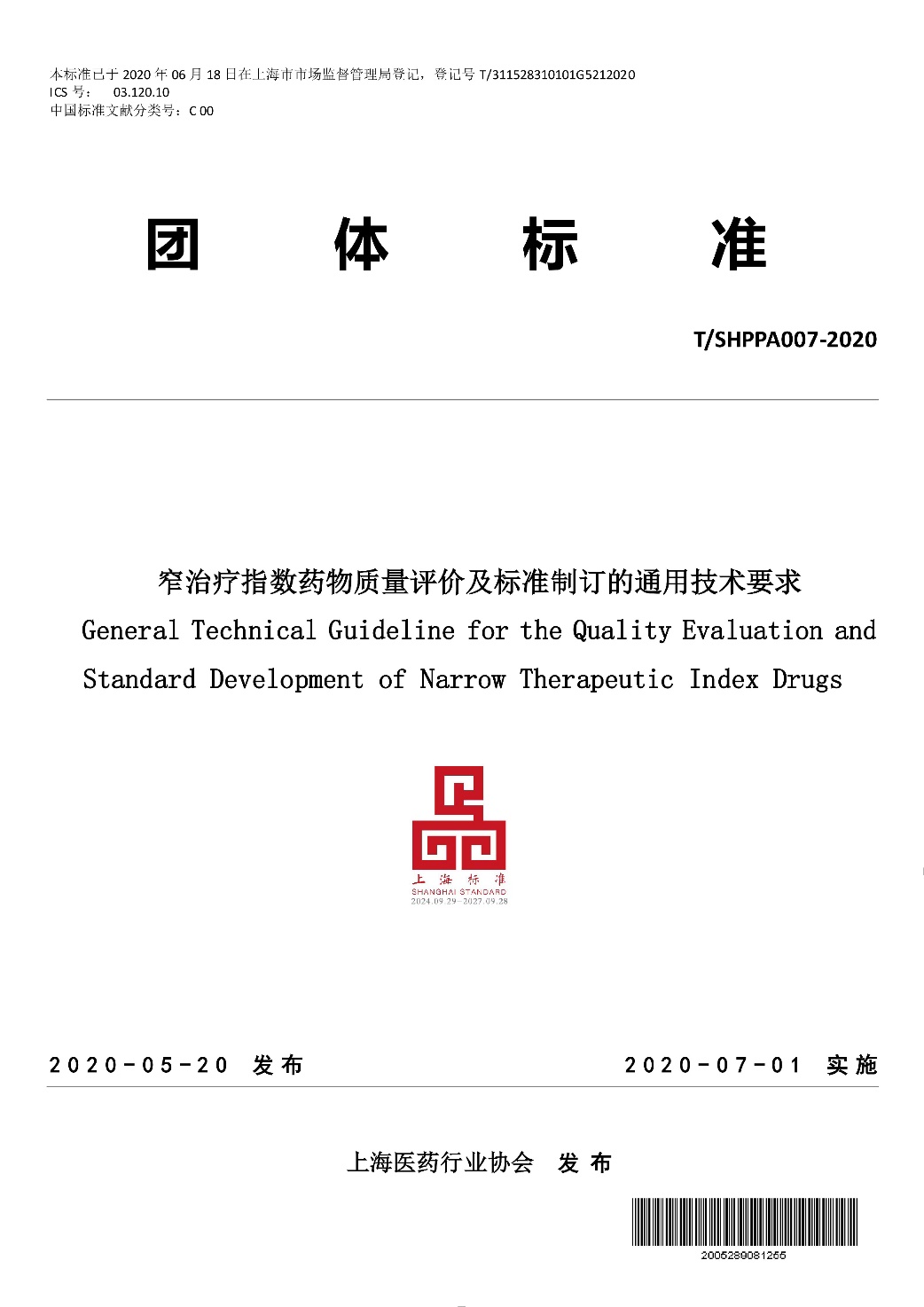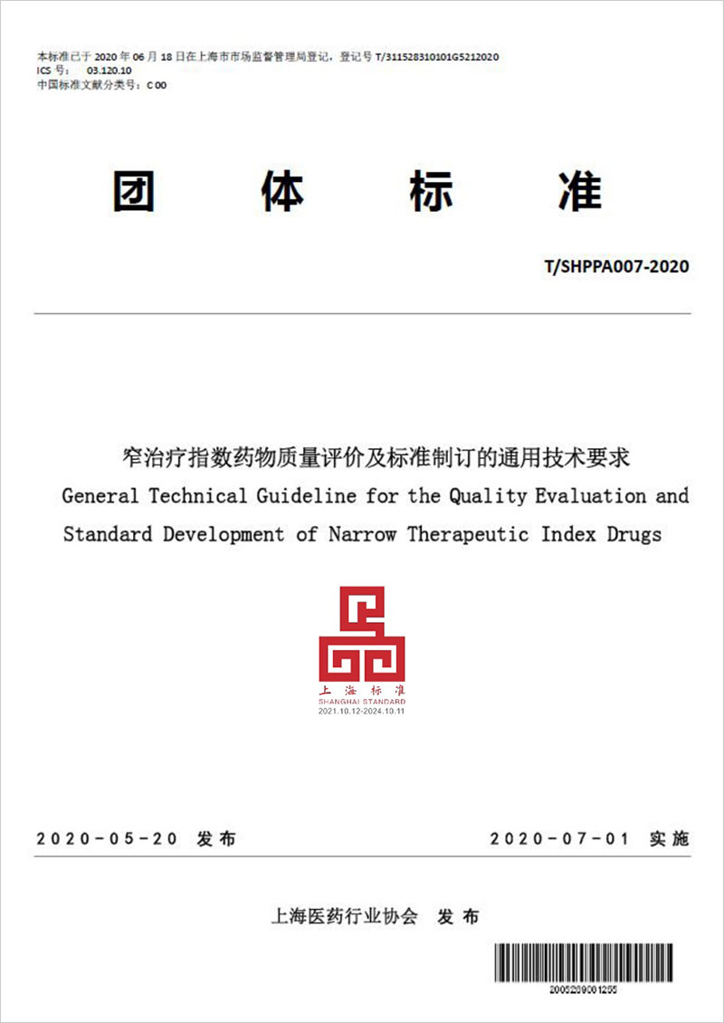标准名称及编号:窄治疗指数药物质量评价及标准制订的通用技术要求(T/SHPPA007——2020)