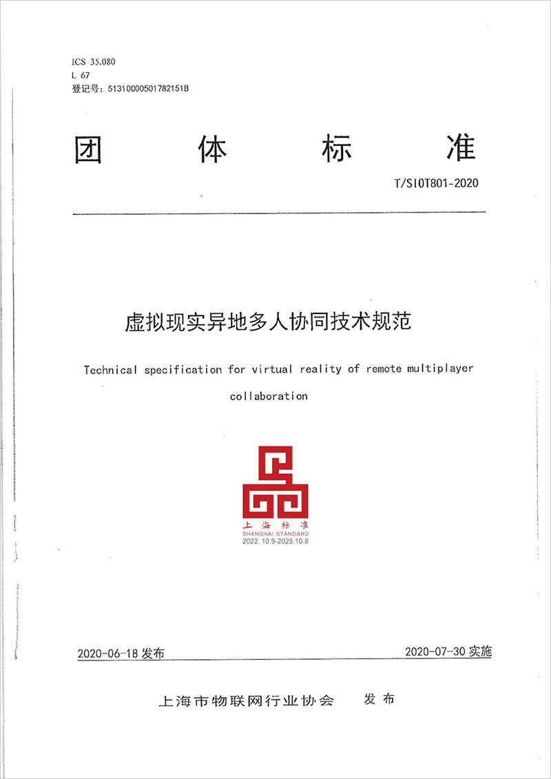 标准名称及编号:虚拟现实异地多人协同技术规范(T/SI0T801—2020)