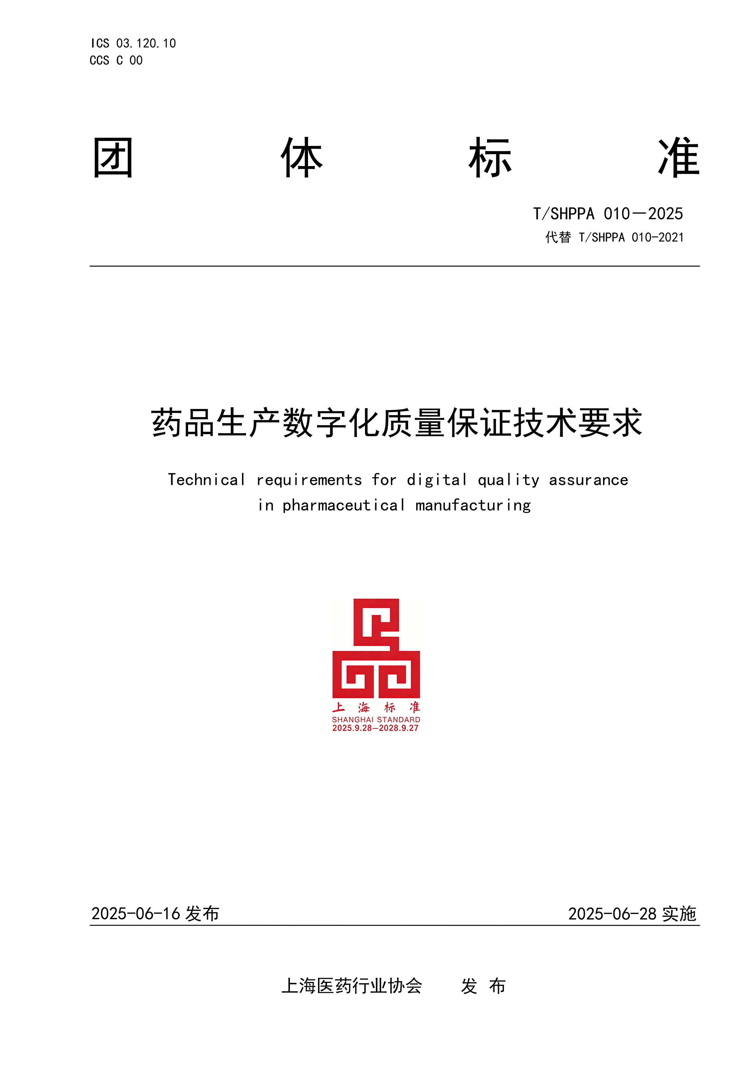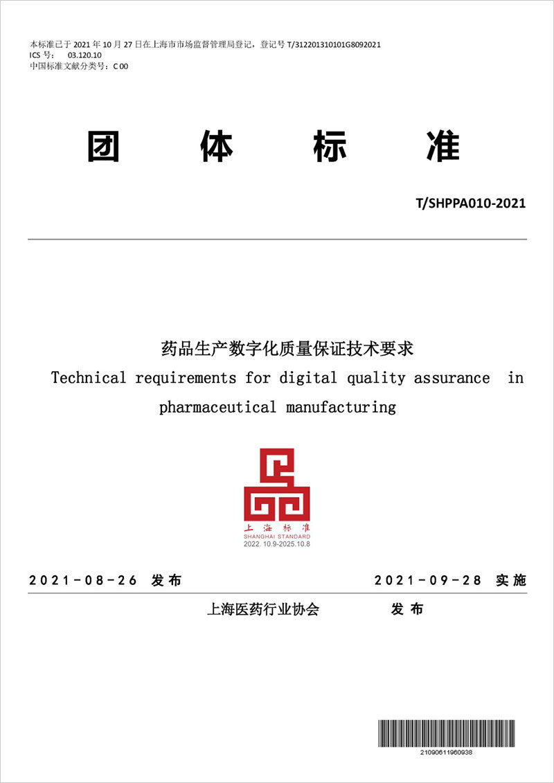 标准名称及编号:药品生产数字化质量保证技术要求(T/SHPPA 010—2021)