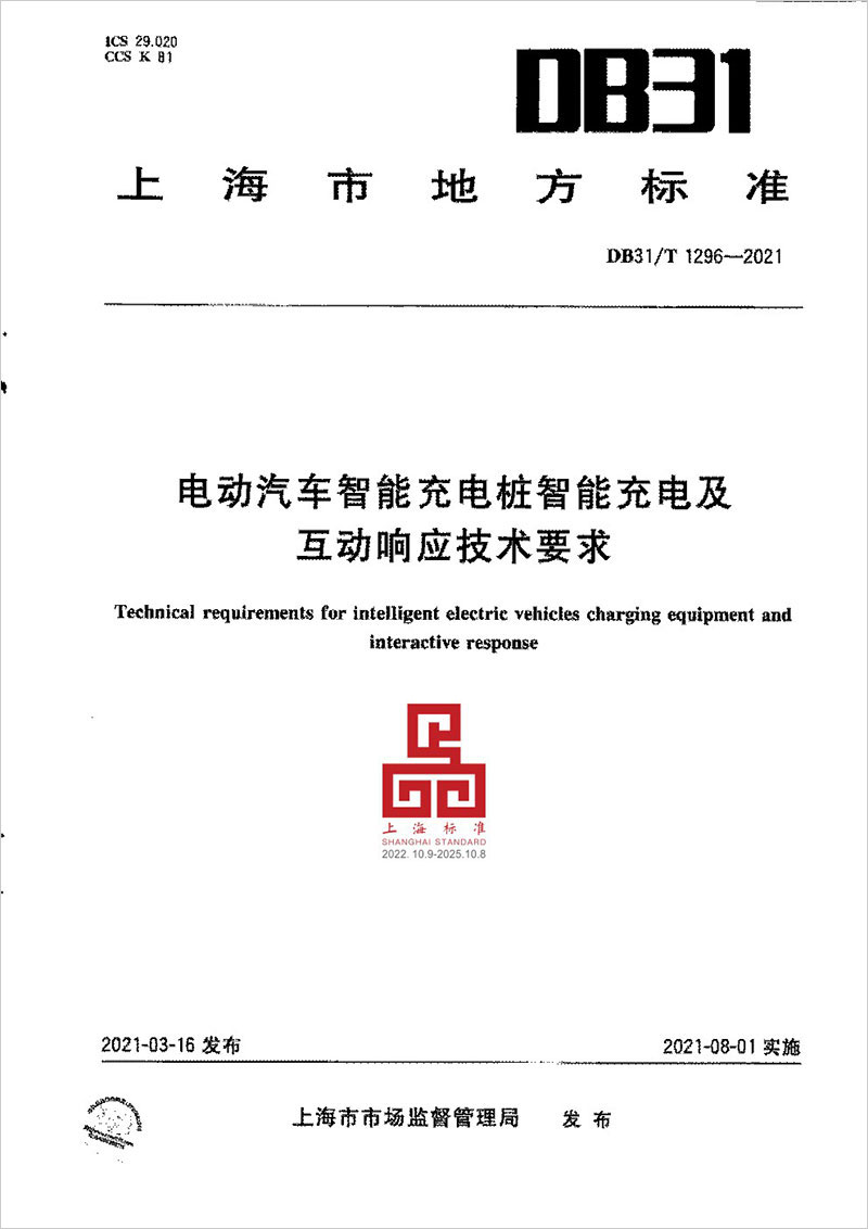 标准名称及编号:电动汽车智能充电桩智能充电及互动响应技术要求(DB31/T 1296—2021)