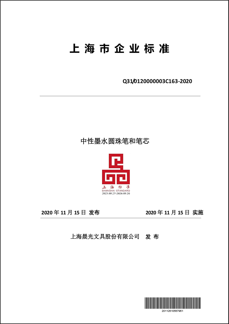 标准名称及编号:中性墨水圆珠笔和笔芯(Q31/0120000003C163—2020)
