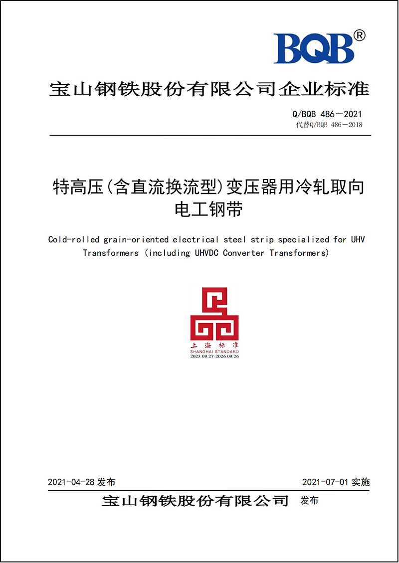 标准名称及编号:特高压(含直流换流型)变压器用冷轧取向电工钢带(Q/BQB 486—2021)