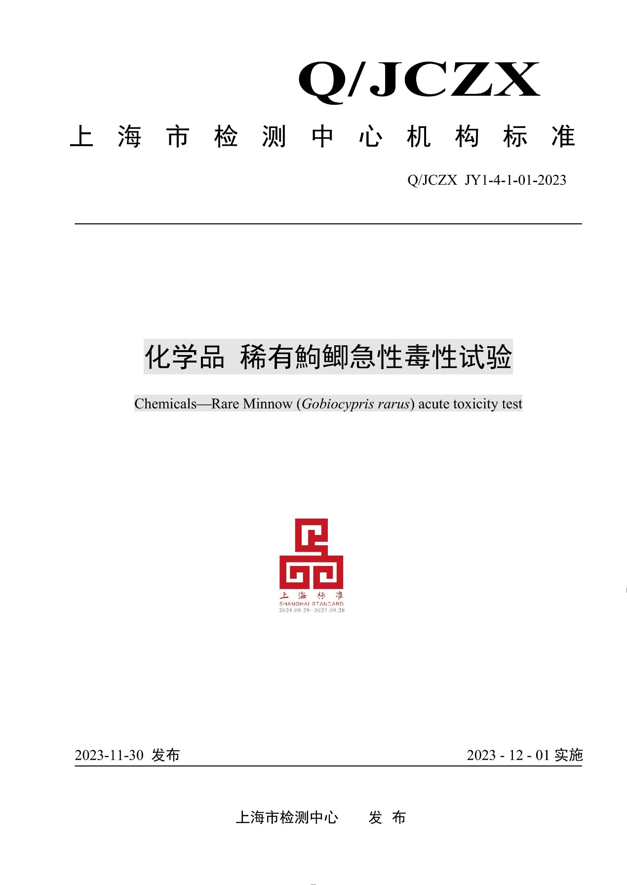 标准名称及编号:化学品 稀有鮈鲫急性毒性试验(Q/JCZX JY1-4-1-01-2023)