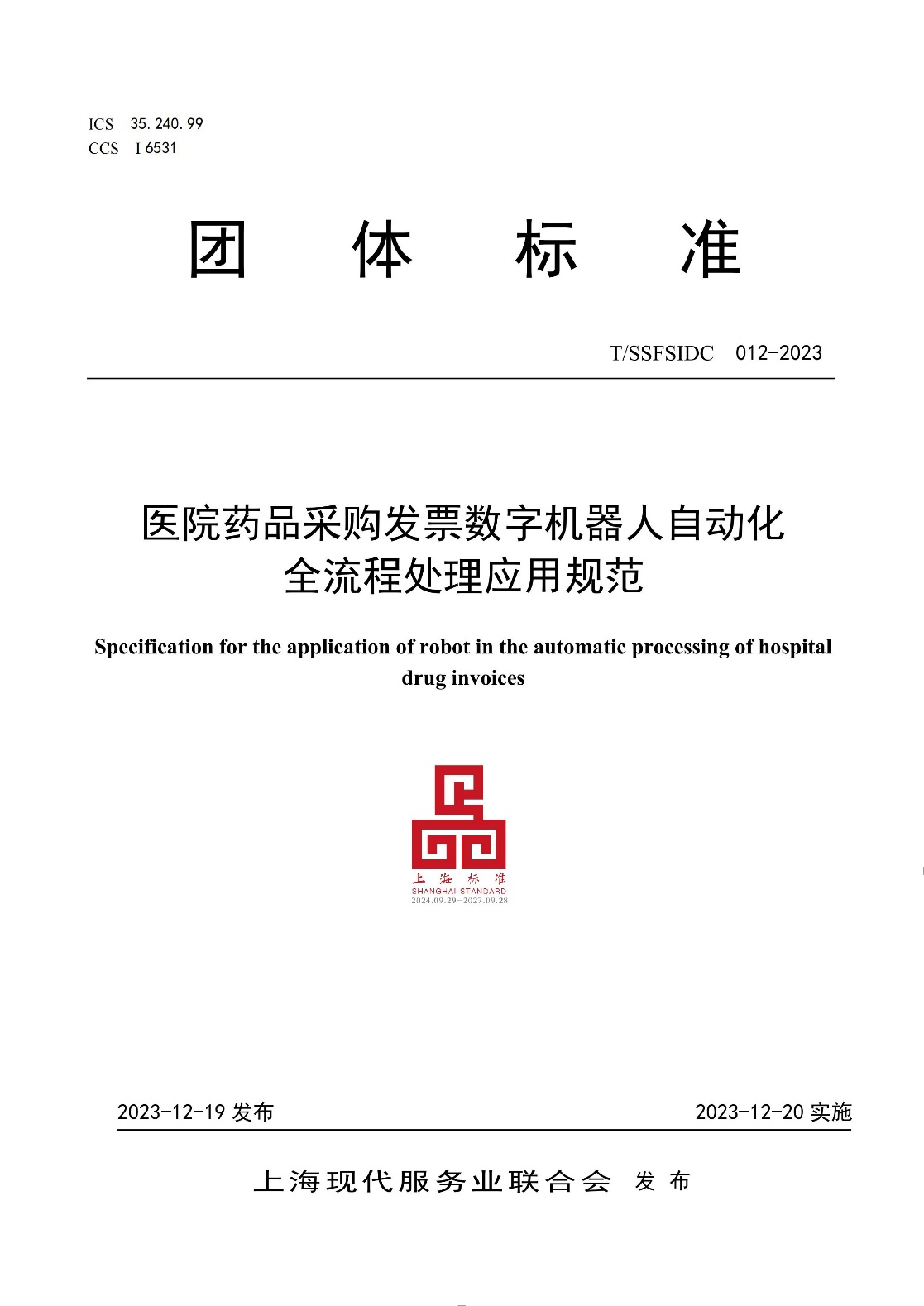 标准名称及编号:医院药品采购发票数字机器人自动化全流程处理应用规范(T/SSFSIDC 012-2023)