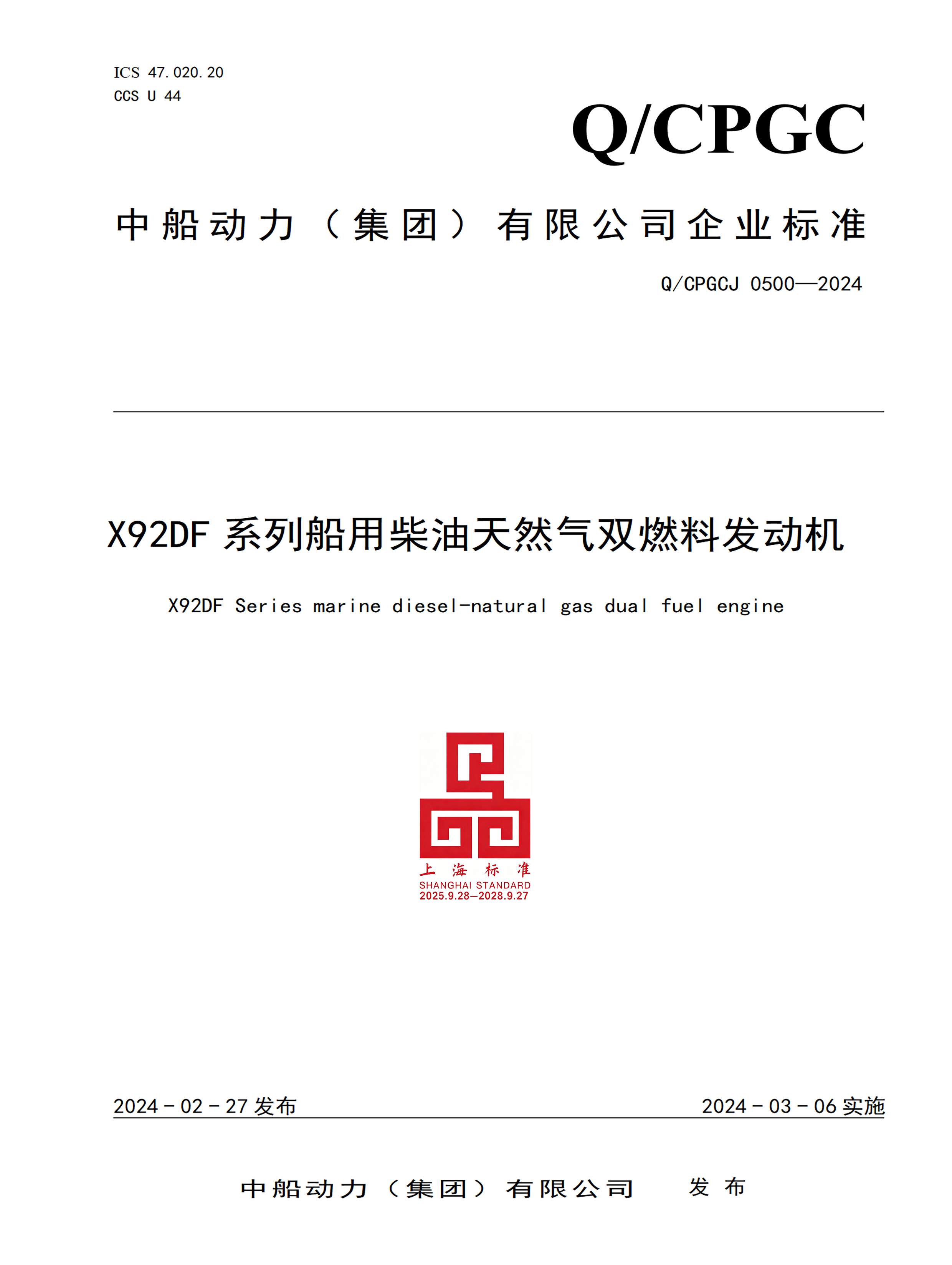 标准名称及编号:X92DF系列船用柴油天然气双燃料发动机(Q/CPGCJ 0500—2024)