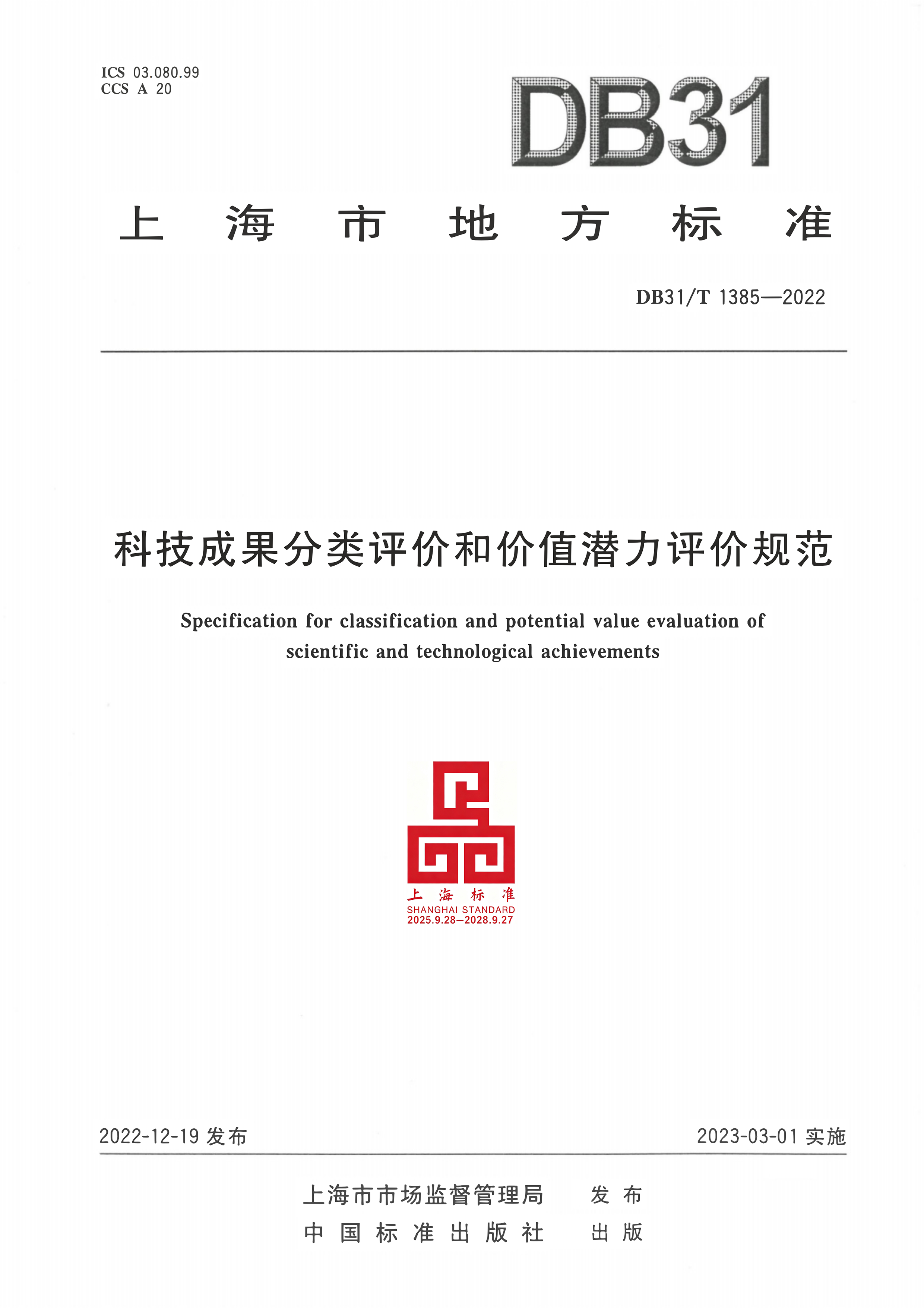 标准名称及编号:科技成果分类和价值潜力评价规范(DB 31/T 1385—2022)