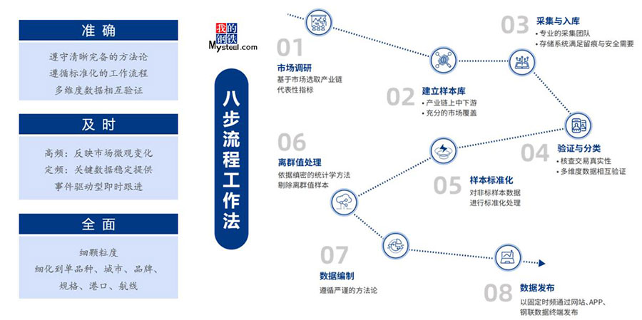 随着对价格指数认识的逐步加深,近年来市场相关方对编制方法论的科学性、发布结果的准确性、运行维护的稳定性,都提出了更高的要求。上海钢联总结提炼了20余年的实践经验,对标国际领先标准,并创新性地利用5G通信、卫星遥感、智慧物流等先进的工业互联网技术,构建无监督机器学习和AI算法预测模型,通过“八步流程”进行基础数据处理和智能化指数编制。目前,《编制准则》在数据采集的先进性、指数编制的智能化、指数应用的广泛性三个维度上都处于国内领先、国际先进的水平。